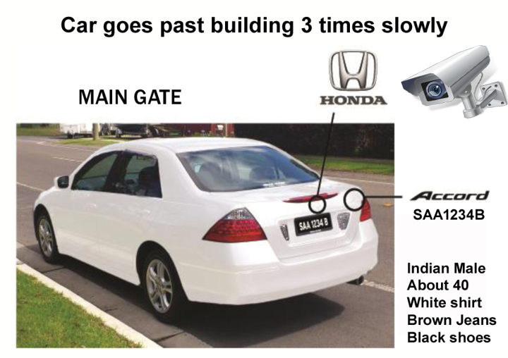 You observed a suspicious person (left picture) driving past the buliding 3 times. Answer the following questions, as per the picture.